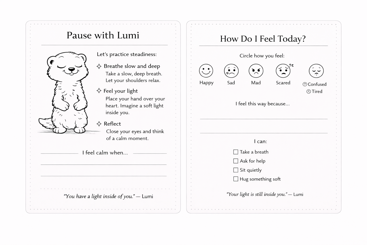 Stories and printable classroom resources that help children explore courage, kindness, friendship, and emotional growth through Lumi’s world.